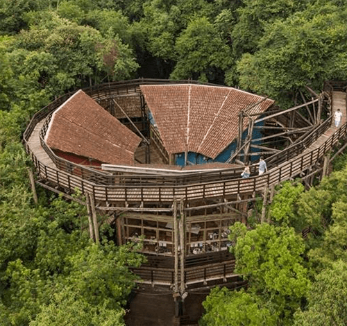 O auditório também é utilizado para pequenos eventos, encontros de pesquisa e atividades comunitárias, tornando-se um ponto de referência para quem se interessa por sustentabilidade e arquitetura ecológica. A experiência de entrar em um espaço completamente construído em troncos, com iluminação natural e atmosfera acolhedora, é um dos destaques do bosque.